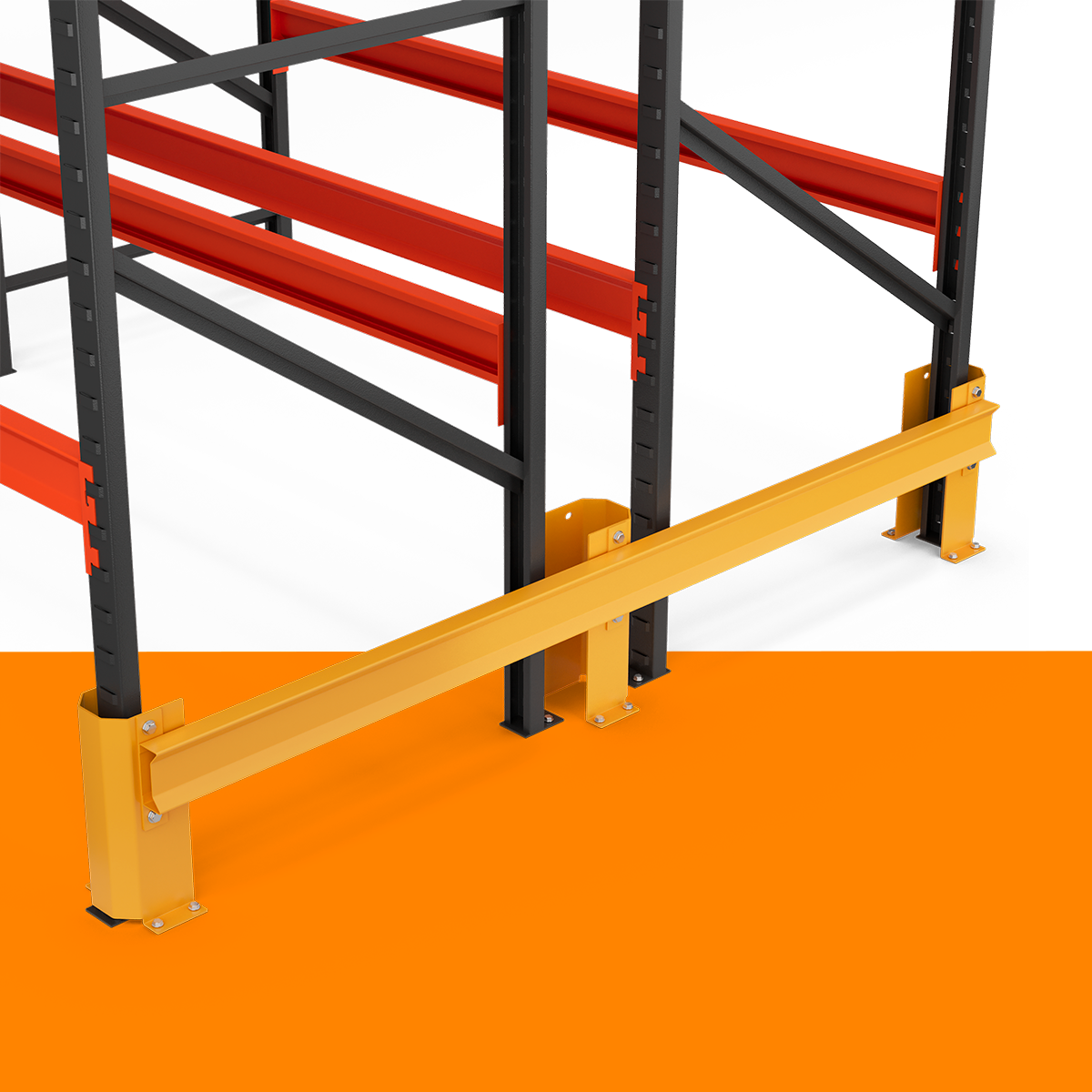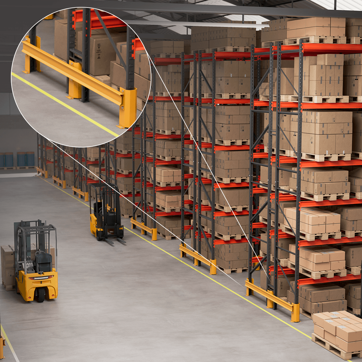 O Conjunto Protetor une dois protetores de coluna com uma barra lateral, reforçando a segurança em corredores, inclusive de profundidade dupla.