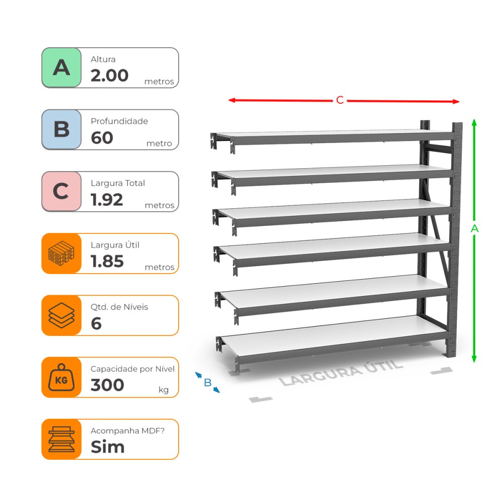 Mini Porta Paletes Complementar A200xL185xP60 - 6 Níveis 300 Kg Por Nível Com MDF