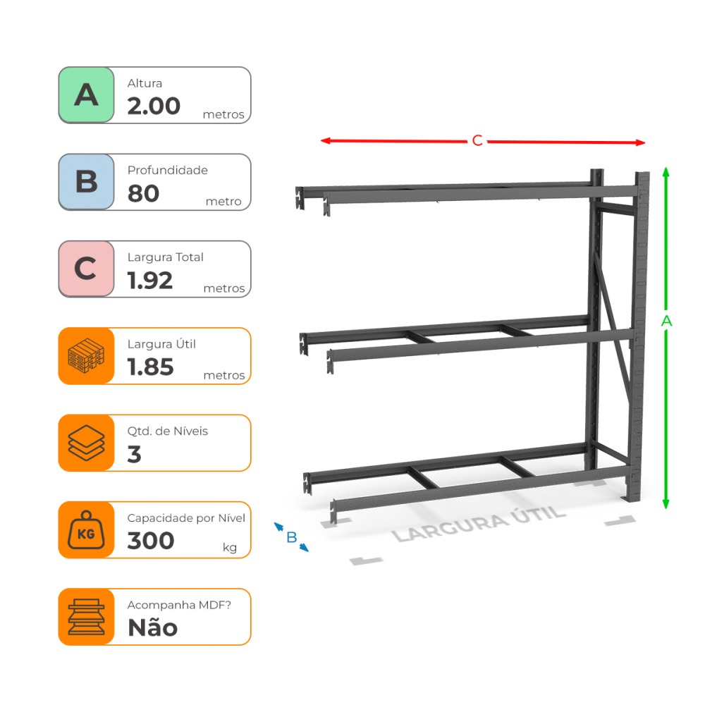 Mini Porta Paletes Complementar A200xL185xP80 - 3 Níveis 300 Kg Por Nível Sem MDF