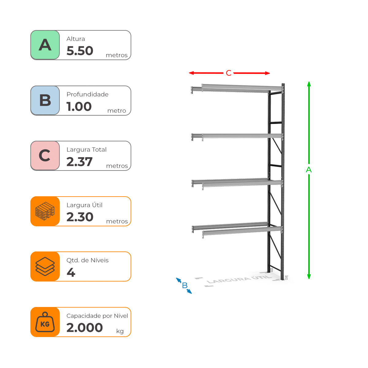 Porta Paletes Complementar A550xL230xP100 - 4 Níveis 2.000 Kg Por Nível